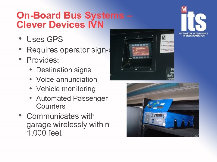 On-Board Bus Systems – Clever Devices IVN • • Uses GPS Requires operator sign-on Provides: • Destination signs • Voice annunciation • Vehicle monitoring • Automated Passenger Counters Communicates with garage wirelessly within 1, 000 feet