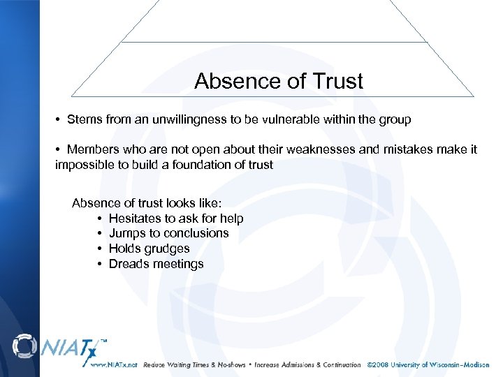Absence of Trust • Stems from an unwillingness to be vulnerable within the group • Members who are not open about their weaknesses and mistakes make it impossible to build a foundation of trust Absence of trust looks like: • Hesitates to ask for help • Jumps to conclusions • Holds grudges • Dreads meetings