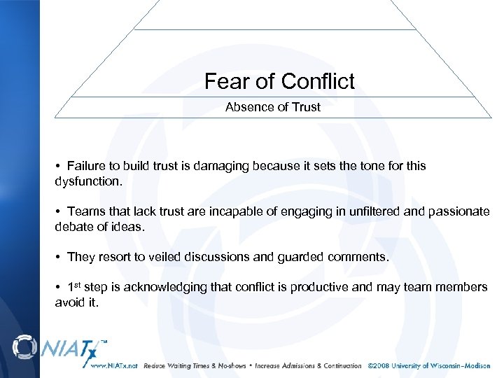 Fear of Conflict Absence of Trust • Failure to build trust is damaging because it sets the tone for this dysfunction. • Teams that lack trust are incapable of engaging in unfiltered and passionate debate of ideas. • They resort to veiled discussions and guarded comments. • 1 st step is acknowledging that conflict is productive and may team members avoid it.