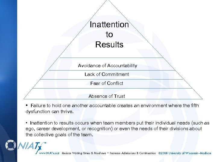 Inattention to Results Avoidance of Accountability Lack of Commitment Fear of Conflict Absence of Trust • Failure to hold one another accountable creates an environment where the fifth dysfunction can thrive. • Inattention to results occurs when team members put their individual needs (such as ego, career development, or recognition) or even the needs of their divisions about the collective goals of the team.