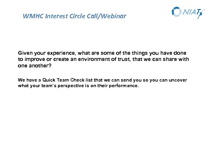 WMHC Interest Circle Call/Webinar Given your experience, what are some of the things you have done to improve or create an environment of trust, that we can share with one another? We have a Quick Team Check list that we can send you so you can uncover what your team’s perspective is on their performance.