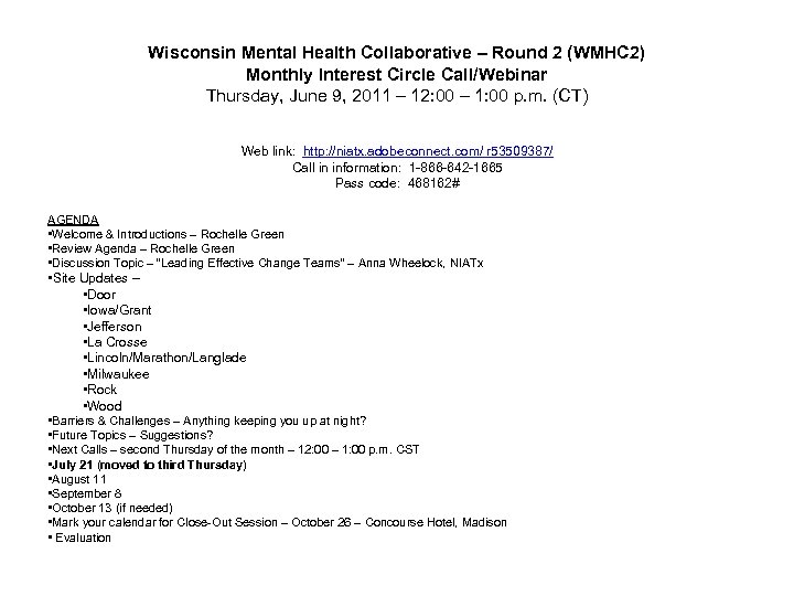 Wisconsin Mental Health Collaborative – Round 2 (WMHC 2) Monthly Interest Circle Call/Webinar Thursday, June 9, 2011 – 12: 00 – 1: 00 p. m. (CT) Web link: http: //niatx. adobeconnect. com/ r 53509387/ Call in information: 1 -866 -642 -1665 Pass code: 468162# AGENDA • Welcome & Introductions – Rochelle Green • Review Agenda – Rochelle Green • Discussion Topic – “Leading Effective Change Teams” – Anna Wheelock, NIATx • Site Updates – • Door • Iowa/Grant • Jefferson • La Crosse • Lincoln/Marathon/Langlade • Milwaukee • Rock • Wood • Barriers & Challenges – Anything keeping you up at night? • Future Topics – Suggestions? • Next Calls – second Thursday of the month – 12: 00 – 1: 00 p. m. CST • July 21 (moved to third Thursday) • August 11 • September 8 • October 13 (if needed) • Mark your calendar for Close-Out Session – October 26 – Concourse Hotel, Madison • Evaluation