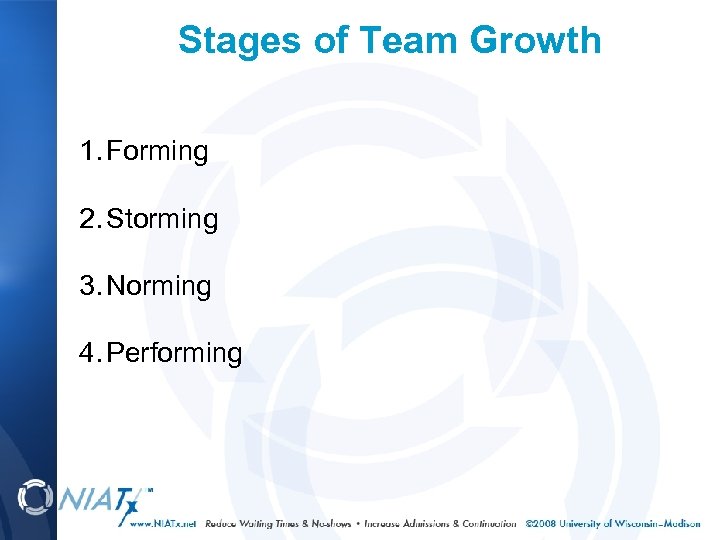 Stages of Team Growth 1. Forming 2. Storming 3. Norming 4. Performing