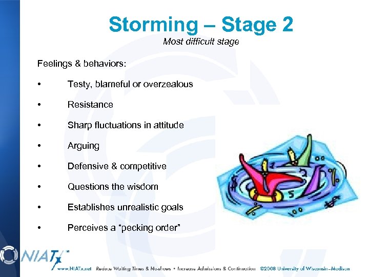 Storming – Stage 2 Most difficult stage Feelings & behaviors: • Testy, blameful or overzealous • Resistance • Sharp fluctuations in attitude • Arguing • Defensive & competitive • Questions the wisdom • Establishes unrealistic goals • Perceives a “pecking order”