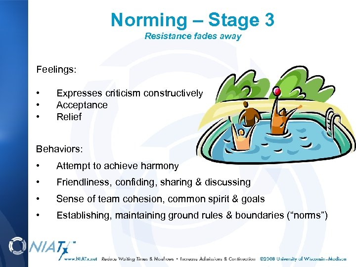 Norming – Stage 3 Resistance fades away Feelings: • • • Expresses criticism constructively Acceptance Relief Behaviors: • Attempt to achieve harmony • Friendliness, confiding, sharing & discussing • Sense of team cohesion, common spirit & goals • Establishing, maintaining ground rules & boundaries (“norms”)