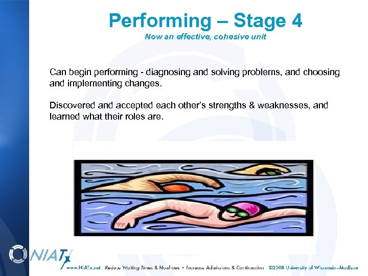 Performing – Stage 4 Now an effective, cohesive unit Can begin performing - diagnosing and solving problems, and choosing and implementing changes. Discovered and accepted each other’s strengths & weaknesses, and learned what their roles are.