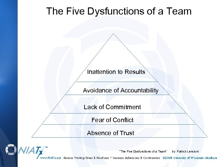 The Five Dysfunctions of a Team Inattention to Results Avoidance of Accountability Lack of Commitment Fear of Conflict Absence of Trust “The Five Dysfunctions of a Team” by Patrick Lencioni