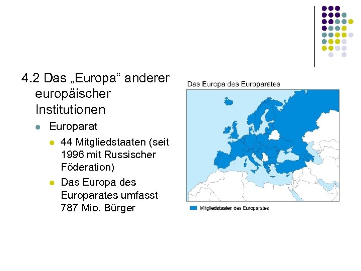4. 2 Das „Europa“ anderer europäischer Institutionen l Europarat l 44 Mitgliedstaaten (seit 1996 mit Russischer Föderation) l Das Europa des Europarates umfasst 787 Mio. Bürger
