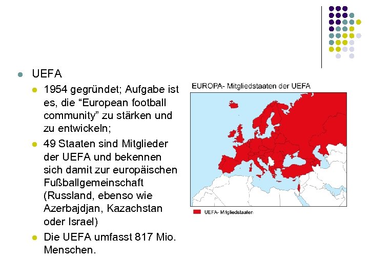 l UEFA l 1954 gegründet; Aufgabe ist es, die “European football community” zu stärken und zu entwickeln; l 49 Staaten sind Mitglieder UEFA und bekennen sich damit zur europäischen Fußballgemeinschaft (Russland, ebenso wie Azerbajdjan, Kazachstan oder Israel) l Die UEFA umfasst 817 Mio. Menschen.