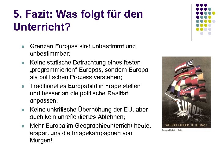 5. Fazit: Was folgt für den Unterricht? l l l Grenzen Europas sind unbestimmt und unbestimmbar; Keine statische Betrachtung eines festen „programmierten“ Europas, sondern Europa als politischen Prozess verstehen; Traditionelles Europabild in Frage stellen und besser an die politische Realität anpassen; Keine unkritische Überhöhung der EU, aber auch kein unreflektiertes Ablehnen; Mehr Europa im Geographieunterricht heute, erspart uns die Imagekampagnen von Morgen!