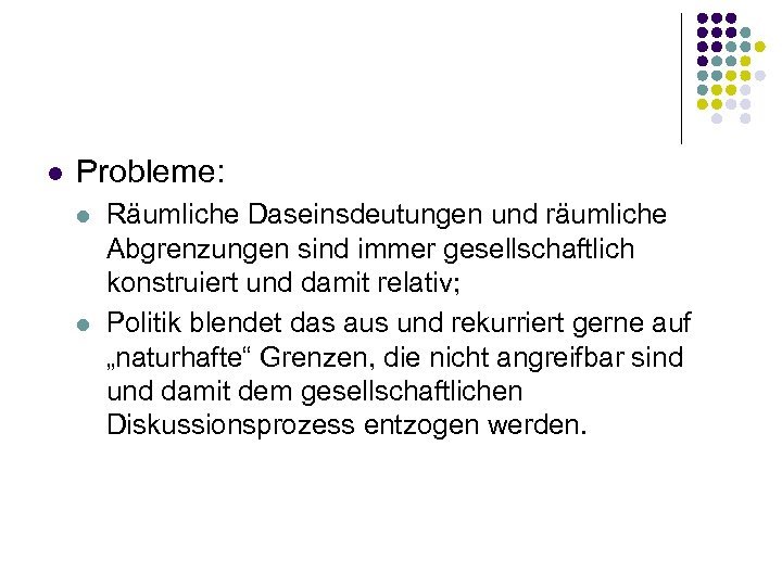 l Probleme: l l Räumliche Daseinsdeutungen und räumliche Abgrenzungen sind immer gesellschaftlich konstruiert und damit relativ; Politik blendet das aus und rekurriert gerne auf „naturhafte“ Grenzen, die nicht angreifbar sind und damit dem gesellschaftlichen Diskussionsprozess entzogen werden.