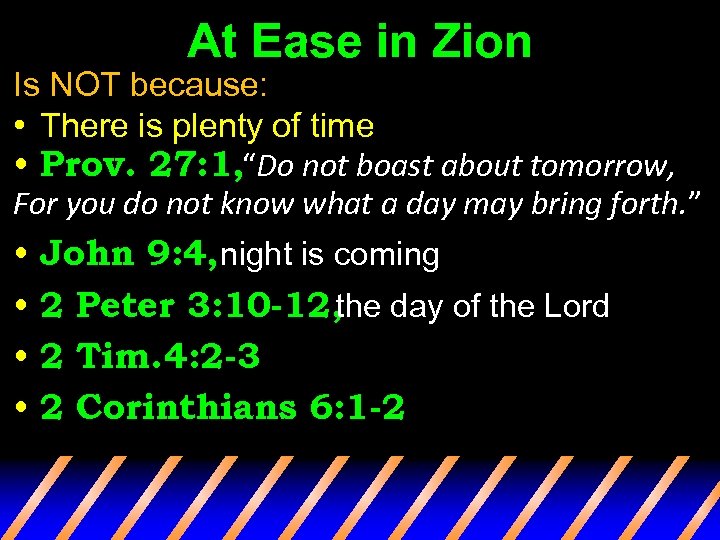 At Ease in Zion Is NOT because: • There is plenty of time • Prov. 27: 1, “Do not boast about tomorrow, For you do not know what a day may bring forth. ” • John 9: 4, night is coming • 2 Peter 3: 10 -12, day of the Lord the • 2 Tim. 4: 2 -3 • 2 Corinthians 6: 1 -2