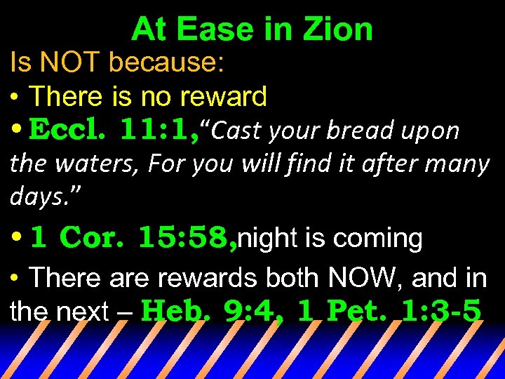 At Ease in Zion Is NOT because: • There is no reward • Eccl. 11: 1, “Cast your bread upon the waters, For you will find it after many days. ” • 1 Cor. 15: 58, night is coming • There are rewards both NOW, and in the next – Heb. 9: 4, 1 Pet. 1: 3 -5