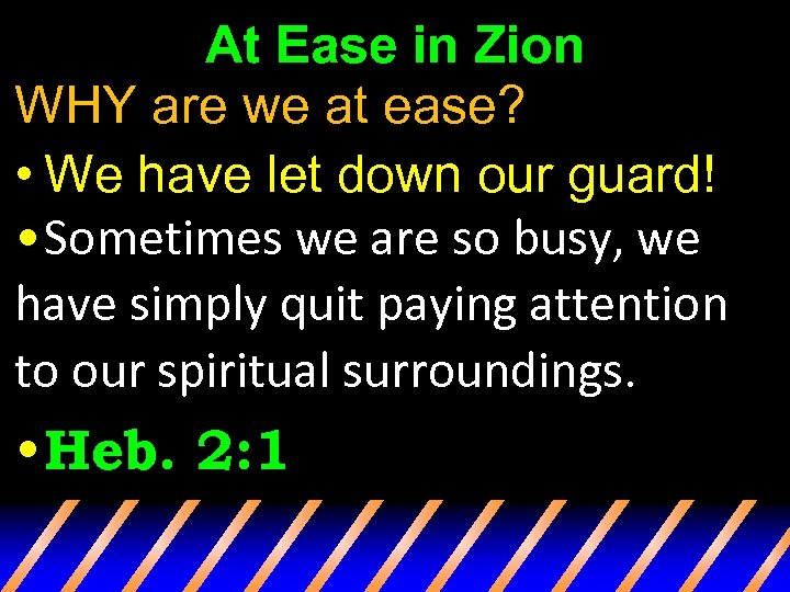 At Ease in Zion WHY are we at ease? • We have let down our guard! • Sometimes we are so busy, we have simply quit paying attention to our spiritual surroundings. • Heb. 2: 1