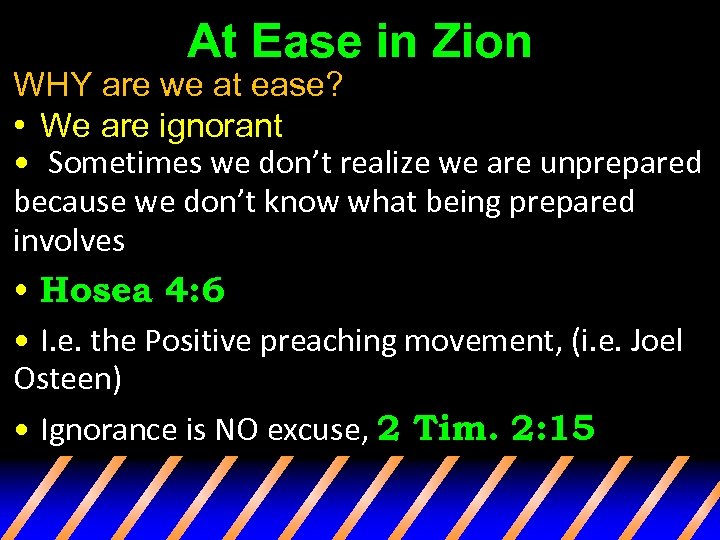 At Ease in Zion WHY are we at ease? • We are ignorant • Sometimes we don’t realize we are unprepared because we don’t know what being prepared involves • Hosea 4: 6 • I. e. the Positive preaching movement, (i. e. Joel Osteen) • Ignorance is NO excuse, 2 Tim. 2: 15
