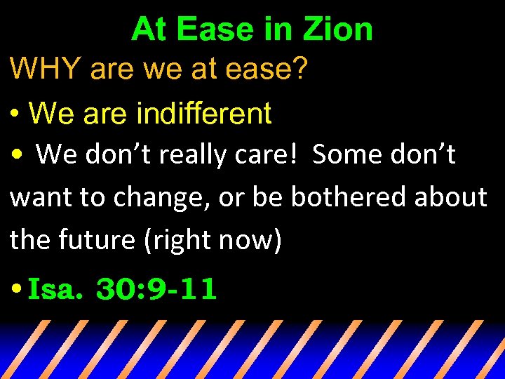 At Ease in Zion WHY are we at ease? • We are indifferent • We don’t really care! Some don’t want to change, or be bothered about the future (right now) • Isa. 30: 9 -11