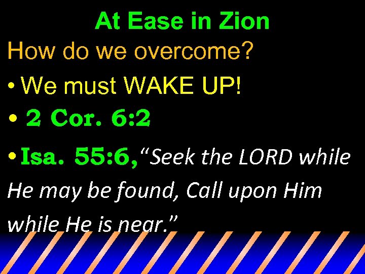 At Ease in Zion How do we overcome? • We must WAKE UP! • 2 Cor. 6: 2 • Isa. 55: 6, “Seek the LORD while He may be found, Call upon Him while He is near. ”