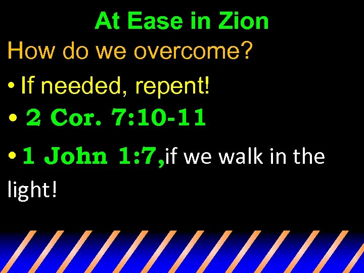 At Ease in Zion How do we overcome? • If needed, repent! • 2 Cor. 7: 10 -11 • 1 John 1: 7, if we walk in the light!