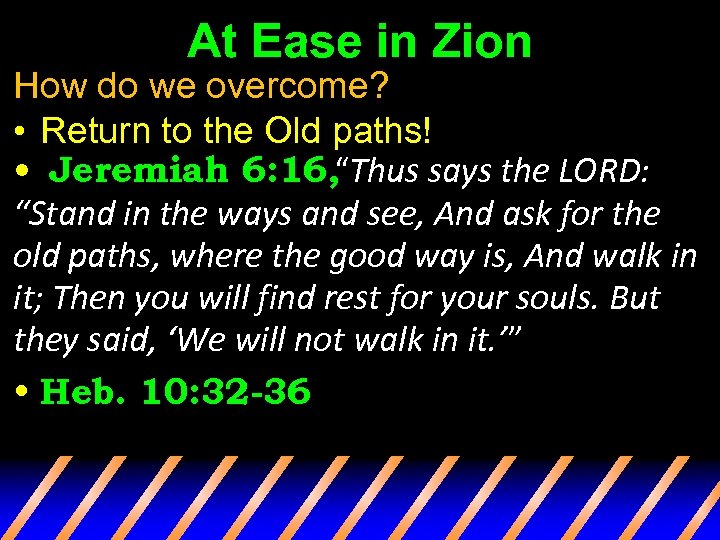 At Ease in Zion How do we overcome? • Return to the Old paths! • Jeremiah 6: 16, “Thus says the LORD: “Stand in the ways and see, And ask for the old paths, where the good way is, And walk in it; Then you will find rest for your souls. But they said, ‘We will not walk in it. ’” • Heb. 10: 32 -36