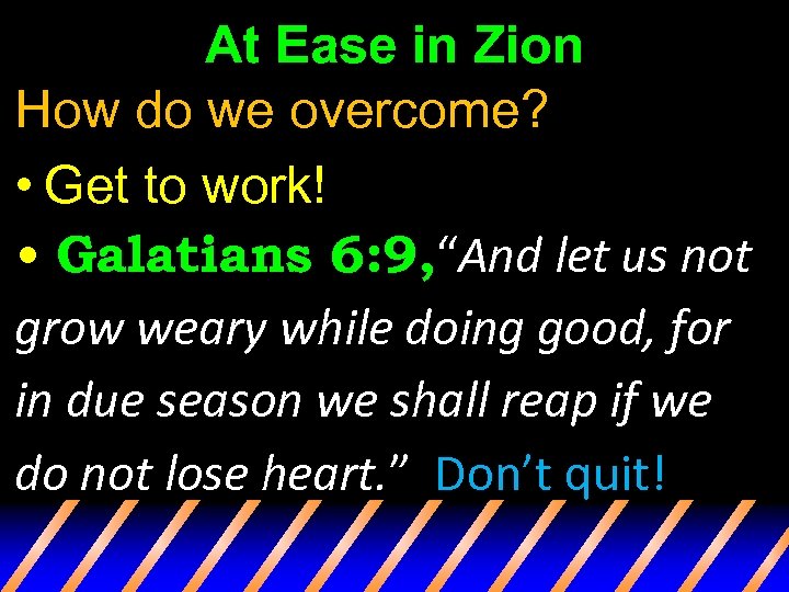At Ease in Zion How do we overcome? • Get to work! • Galatians 6: 9, “And let us not grow weary while doing good, for in due season we shall reap if we do not lose heart. ” Don’t quit!