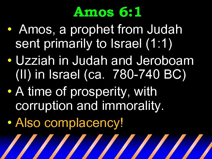 Amos 6: 1 • Amos, a prophet from Judah sent primarily to Israel (1: 1) • Uzziah in Judah and Jeroboam (II) in Israel (ca. 780 -740 BC) • A time of prosperity, with corruption and immorality. • Also complacency!