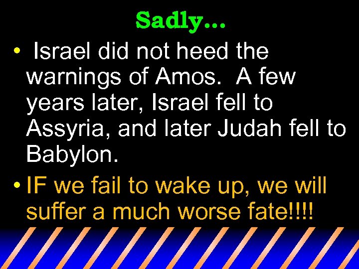 Sadly… • Israel did not heed the warnings of Amos. A few years later, Israel fell to Assyria, and later Judah fell to Babylon. • IF we fail to wake up, we will suffer a much worse fate!!!!