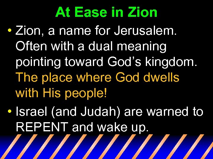 At Ease in Zion • Zion, a name for Jerusalem. Often with a dual meaning pointing toward God’s kingdom. The place where God dwells with His people! • Israel (and Judah) are warned to REPENT and wake up.