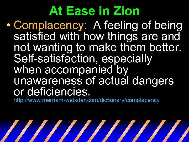 At Ease in Zion • Complacency: A feeling of being satisfied with how things are and not wanting to make them better. Self-satisfaction, especially when accompanied by unawareness of actual dangers or deficiencies. http: //www. merriam-webster. com/dictionary/complacency