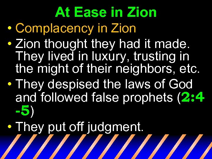 At Ease in Zion • Complacency in Zion • Zion thought they had it made. They lived in luxury, trusting in the might of their neighbors, etc. • They despised the laws of God and followed false prophets (2: 4 -5) • They put off judgment.