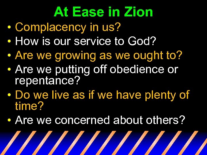 At Ease in Zion • • Complacency in us? How is our service to God? Are we growing as we ought to? Are we putting off obedience or repentance? • Do we live as if we have plenty of time? • Are we concerned about others?