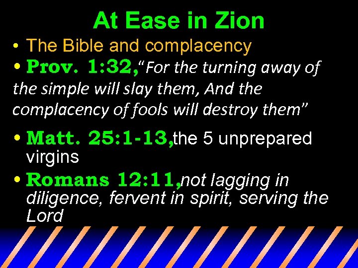 At Ease in Zion • The Bible and complacency • Prov. 1: 32, “For the turning away of the simple will slay them, And the complacency of fools will destroy them” • Matt. 25: 1 -13, the 5 unprepared virgins • Romans 12: 11, not lagging in diligence, fervent in spirit, serving the Lord