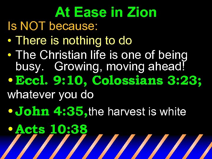 At Ease in Zion Is NOT because: • There is nothing to do • The Christian life is one of being busy. Growing, moving ahead! • Eccl. 9: 10, Colossians 3: 23; whatever you do • John 4: 35, the harvest is white • Acts 10: 38