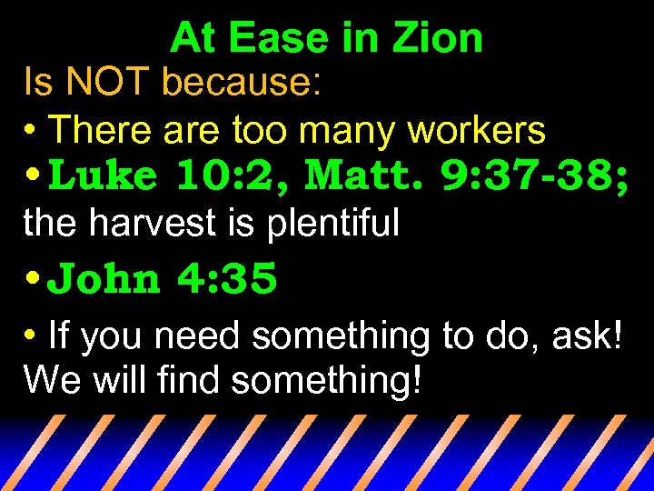 At Ease in Zion Is NOT because: • There are too many workers • Luke 10: 2, Matt. 9: 37 -38; the harvest is plentiful • John 4: 35 • If you need something to do, ask! We will find something!