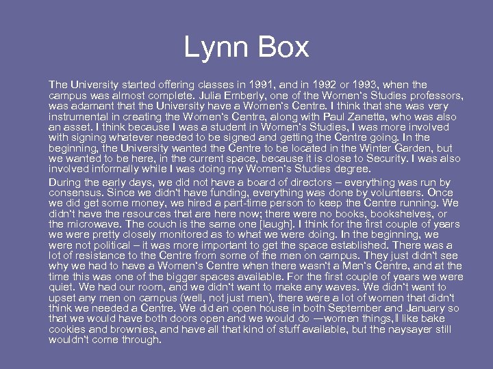 Lynn Box The University started offering classes in 1991, and in 1992 or 1993, when the campus was almost complete. Julia Emberly, one of the Women‘s Studies professors, was adamant that the University have a Women‘s Centre. I think that she was very instrumental in creating the Women‘s Centre, along with Paul Zanette, who was also an asset. I think because I was a student in Women‘s Studies, I was more involved with signing whatever needed to be signed and getting the Centre going. In the beginning, the University wanted the Centre to be located in the Winter Garden, but we wanted to be here, in the current space, because it is close to Security. I was also involved informally while I was doing my Women‘s Studies degree. During the early days, we did not have a board of directors – everything was run by consensus. Since we didn‘t have funding, everything was done by volunteers. Once we did get some money, we hired a part-time person to keep the Centre running. We didn‘t have the resources that are here now; there were no books, bookshelves, or the microwave. The couch is the same one [laugh]. I think for the first couple of years we were pretty closely monitored as to what we were doing. In the beginning, we were not political – it was more important to get the space established. There was a lot of resistance to the Centre from some of the men on campus. They just didn‘t see why we had to have a Women‘s Centre when there wasn‘t a Men‘s Centre, and at the time this was one of the bigger spaces available. For the first couple of years we were quiet. We had our room, and we didn‘t want to make any waves. We didn‘t want to upset any men on campus (well, not just men), there were a lot of women that didn‘t think we needed a Centre. We did an open house in both September and January so that we would have both doors open and we would do ―women things, ‖ like bake cookies and brownies, and have all that kind of stuff available, but the naysayer still wouldn‘t come through.