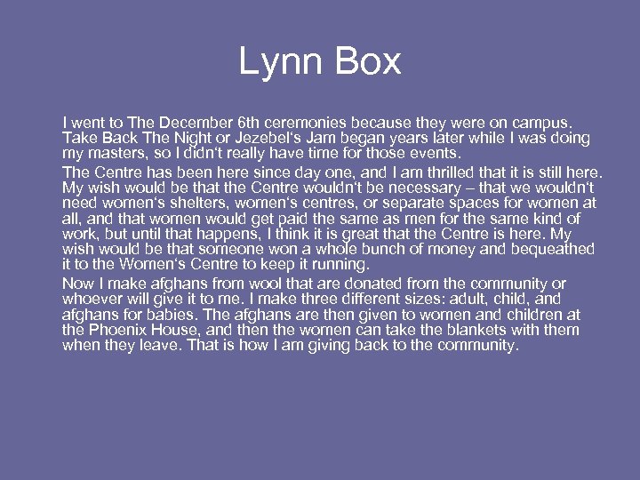 Lynn Box I went to The December 6 th ceremonies because they were on campus. Take Back The Night or Jezebel‘s Jam began years later while I was doing my masters, so I didn‘t really have time for those events. The Centre has been here since day one, and I am thrilled that it is still here. My wish would be that the Centre wouldn‘t be necessary – that we wouldn‘t need women‘s shelters, women‘s centres, or separate spaces for women at all, and that women would get paid the same as men for the same kind of work, but until that happens, I think it is great the Centre is here. My wish would be that someone won a whole bunch of money and bequeathed it to the Women‘s Centre to keep it running. Now I make afghans from wool that are donated from the community or whoever will give it to me. I make three different sizes: adult, child, and afghans for babies. The afghans are then given to women and children at the Phoenix House, and then the women can take the blankets with them when they leave. That is how I am giving back to the community.