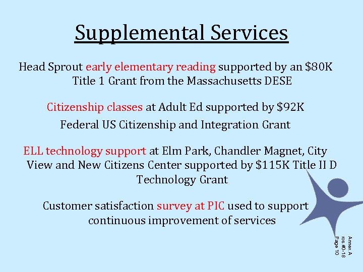 Supplemental Services Head Sprout early elementary reading supported by an $80 K Title 1 Grant from the Massachusetts DESE Citizenship classes at Adult Ed supported by $92 K Federal US Citizenship and Integration Grant ELL technology support at Elm Park, Chandler Magnet, City View and New Citizens Center supported by $115 K Title II D Technology Grant Customer satisfaction survey at PIC used to support continuous improvement of services Annex A ros #0 -18 Page 10