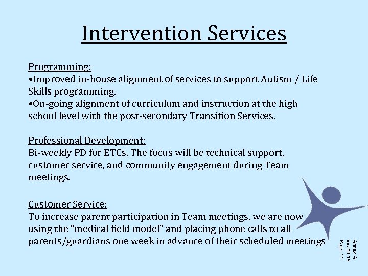 Intervention Services Programming: • Improved in-house alignment of services to support Autism / Life Skills programming. • On-going alignment of curriculum and instruction at the high school level with the post-secondary Transition Services. Professional Development: Bi-weekly PD for ETCs. The focus will be technical support, customer service, and community engagement during Team meetings. Annex A ros #0 -18 Page 11 Customer Service: To increase parent participation in Team meetings, we are now using the “medical field model” and placing phone calls to all parents/guardians one week in advance of their scheduled meetings