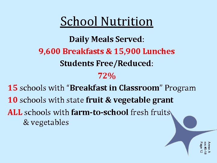 School Nutrition Daily Meals Served: 9, 600 Breakfasts & 15, 900 Lunches Students Free/Reduced: 72% 15 schools with “Breakfast in Classroom” Program 10 schools with state fruit & vegetable grant ALL schools with farm-to-school fresh fruits & vegetables Annex A ros #0 -18 Page 12