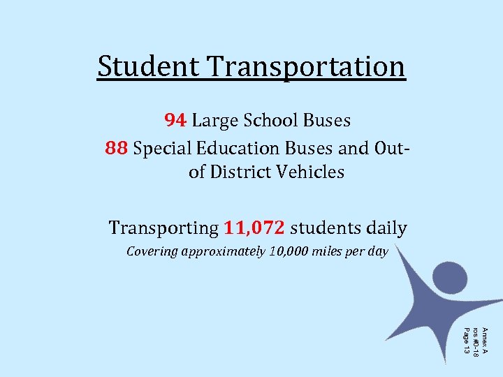 Student Transportation 94 Large School Buses 88 Special Education Buses and Outof District Vehicles Transporting 11, 072 students daily Covering approximately 10, 000 miles per day Annex A ros #0 -18 Page 13