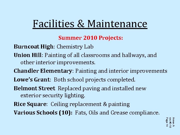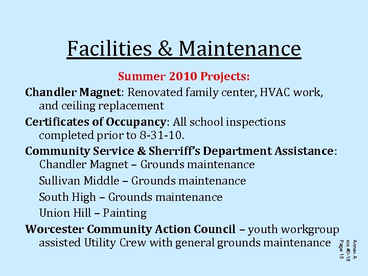 Facilities & Maintenance Summer 2010 Projects: Burncoat High: Chemistry Lab Union Hill: Painting of all classrooms and hallways, and other interior improvements. Chandler Elementary: Painting and interior improvements Lowe’s Grant: Both school projects completed. Belmont Street Replaced paving and installed new exterior security lighting. Rice Square: Ceiling replacement & painting Various Schools (10): Fats, Oils and Grease compliance. Annex A ros #0 -18 Page 14