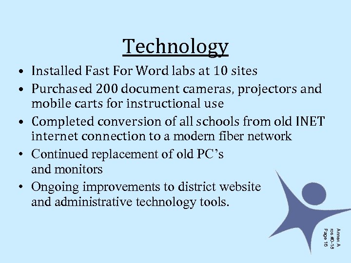 Technology • Installed Fast For Word labs at 10 sites • Purchased 200 document cameras, projectors and mobile carts for instructional use • Completed conversion of all schools from old INET internet connection to a modern fiber network • Continued replacement of old PC’s and monitors • Ongoing improvements to district website and administrative technology tools. Annex A ros #0 -18 Page 16
