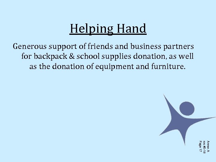 Helping Hand Generous support of friends and business partners for backpack & school supplies donation, as well as the donation of equipment and furniture. Annex A ros #0 -18 Page 17
