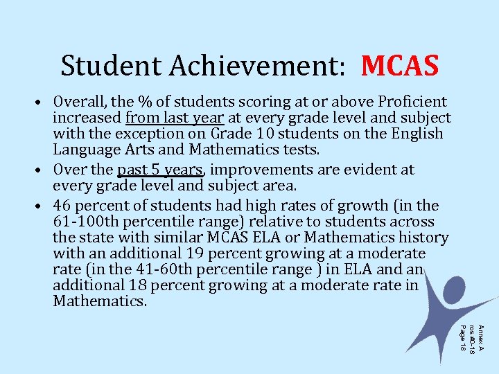 Student Achievement: MCAS • Overall, the % of students scoring at or above Proficient increased from last year at every grade level and subject with the exception on Grade 10 students on the English Language Arts and Mathematics tests. • Over the past 5 years, improvements are evident at every grade level and subject area. • 46 percent of students had high rates of growth (in the 61 -100 th percentile range) relative to students across the state with similar MCAS ELA or Mathematics history with an additional 19 percent growing at a moderate (in the 41 -60 th percentile range ) in ELA and an additional 18 percent growing at a moderate in Mathematics. Annex A ros #0 -18 Page 18