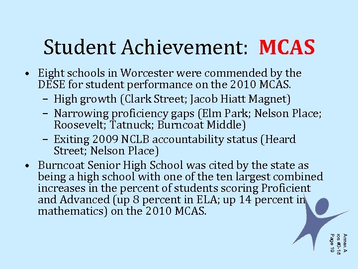 Student Achievement: MCAS • Eight schools in Worcester were commended by the DESE for student performance on the 2010 MCAS. – High growth (Clark Street; Jacob Hiatt Magnet) – Narrowing proficiency gaps (Elm Park; Nelson Place; Roosevelt; Tatnuck; Burncoat Middle) – Exiting 2009 NCLB accountability status (Heard Street; Nelson Place) • Burncoat Senior High School was cited by the state as being a high school with one of the ten largest combined increases in the percent of students scoring Proficient and Advanced (up 8 percent in ELA; up 14 percent in mathematics) on the 2010 MCAS. Annex A ros #0 -18 Page 19