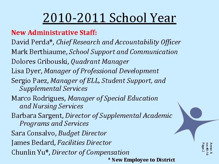 2010 -2011 School Year * New Employee to District Annex A ros #0 -18 Page 2 New Administrative Staff: David Perda*, Chief Research and Accountability Officer Mark Berthiaume, School Support and Communication Dolores Gribouski, Quadrant Manager Lisa Dyer, Manager of Professional Development Sergio Paez, Manager of ELL, Student Support, and Supplemental Services Marco Rodrigues, Manager of Special Education and Nursing Services Barbara Sargent, Director of Supplemental Academic Programs and Services Sara Consalvo, Budget Director James Bedard, Facilities Director Chunlin Yu*, Director of Compensation