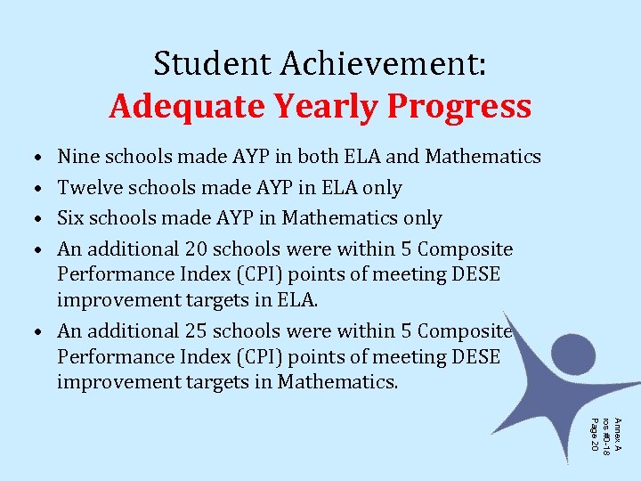 Student Achievement: Adequate Yearly Progress • • Nine schools made AYP in both ELA and Mathematics Twelve schools made AYP in ELA only Six schools made AYP in Mathematics only An additional 20 schools were within 5 Composite Performance Index (CPI) points of meeting DESE improvement targets in ELA. • An additional 25 schools were within 5 Composite Performance Index (CPI) points of meeting DESE improvement targets in Mathematics. Annex A ros #0 -18 Page 20