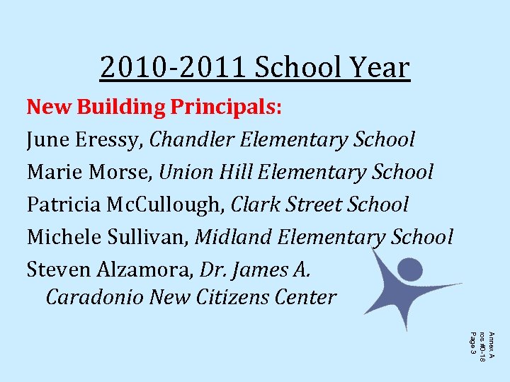 2010 -2011 School Year New Building Principals: June Eressy, Chandler Elementary School Marie Morse, Union Hill Elementary School Patricia Mc. Cullough, Clark Street School Michele Sullivan, Midland Elementary School Steven Alzamora, Dr. James A. Caradonio New Citizens Center Annex A ros #0 -18 Page 3