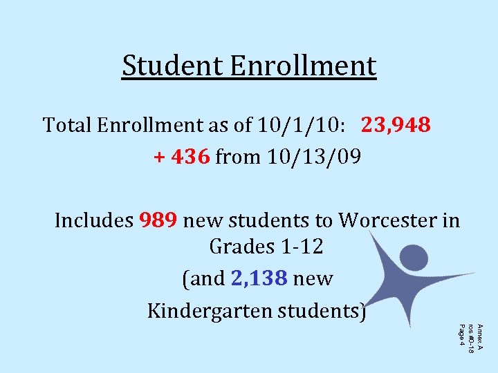 Student Enrollment Total Enrollment as of 10/1/10: 23, 948 + 436 from 10/13/09 Includes 989 new students to Worcester in Grades 1 -12 (and 2, 138 new Kindergarten students) Annex A ros #0 -18 Page 4