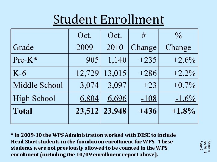 Student Enrollment Grade Pre-K* Oct. 2009 905 Oct. # 2010 Change % Change 1, 140 +235 +2. 6% K-6 Middle School 12, 729 13, 015 3, 074 3, 097 +286 +23 +2. 2% +0. 7% High School Total 6, 804 6, 696 23, 512 23, 948 -108 +436 -1. 6% +1. 8% Annex A ros #0 -18 Page 5 * In 2009 -10 the WPS Administration worked with DESE to include Head Start students in the foundation enrollment for WPS. These students were not previously allowed to be counted in the WPS enrollment (including the 10/09 enrollment report above).