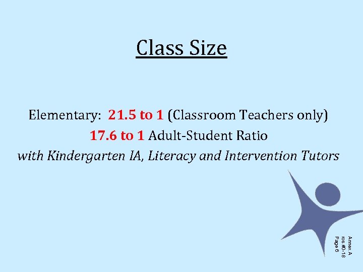 Class Size Elementary: 21. 5 to 1 (Classroom Teachers only) 17. 6 to 1 Adult-Student Ratio with Kindergarten IA, Literacy and Intervention Tutors Annex A ros #0 -18 Page 6
